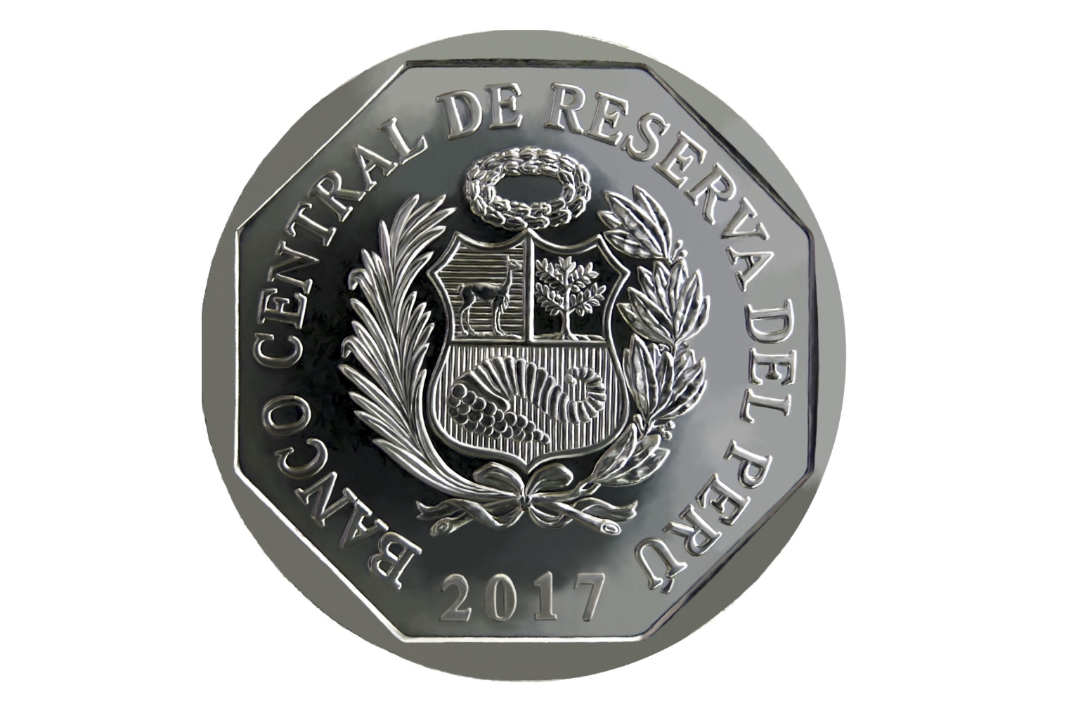 En el anverso se observa en el centro el Escudo de Armas del Perú rodeado de la leyenda “BANCO CENTRAL DE RESERVA DEL PERÚ”, el año de acuñación y un polígono inscrito de ocho lados que forma el filete de la moneda.